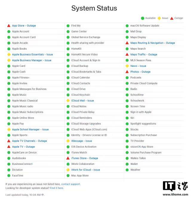 1 月 21 日消息,苹果系统状态页面今日(1 月 21 日)上午更新显示,由于持续性故障,部分用户可能正遭遇包括 App Store、Apple TV 和 iTunes 商店在内的多项苹果服务中断。